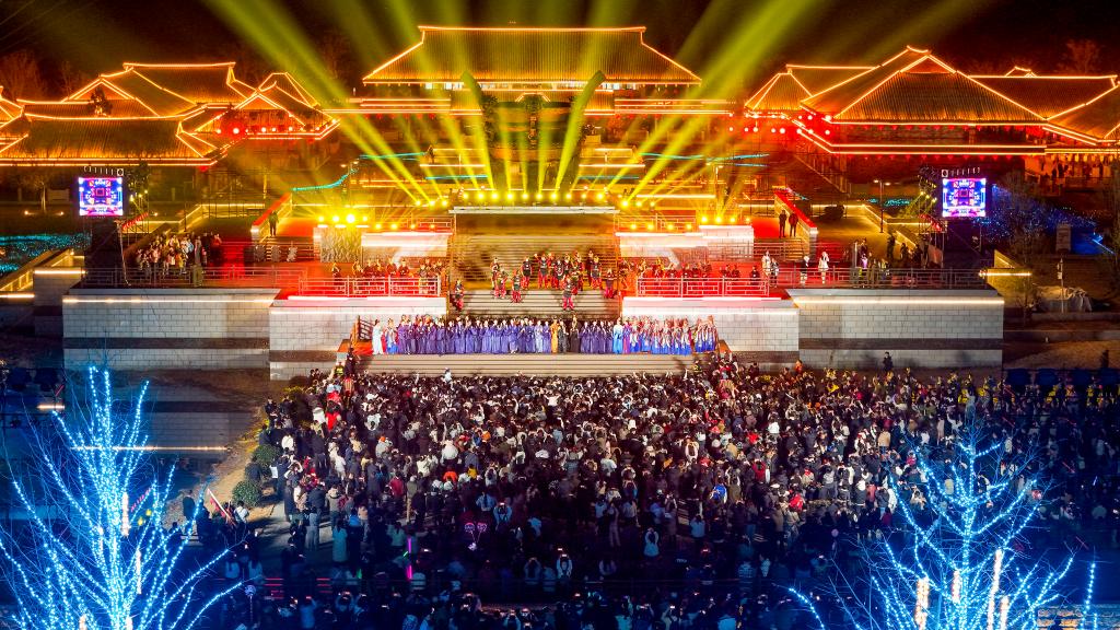 “荆州十二时辰·楚乐八百年”在荆州纪南生态文化旅游区上演,再现楚国辉煌历史。(张梦瑶 摄)