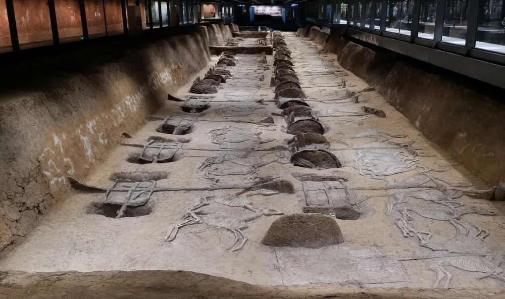 荆州熊家冢国家考古遗址公园一号车马坑出土的车马阵,气势恢宏。新华社记者 余国庆 摄