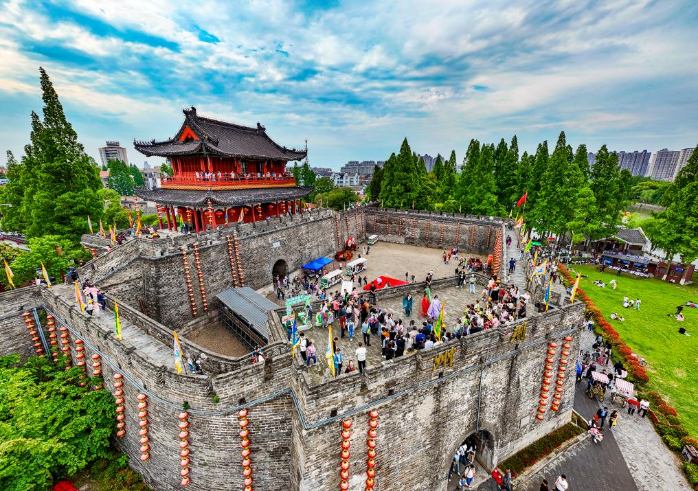市民游客登上荆州古城,感受古城文化魅力。(张梦瑶 摄)